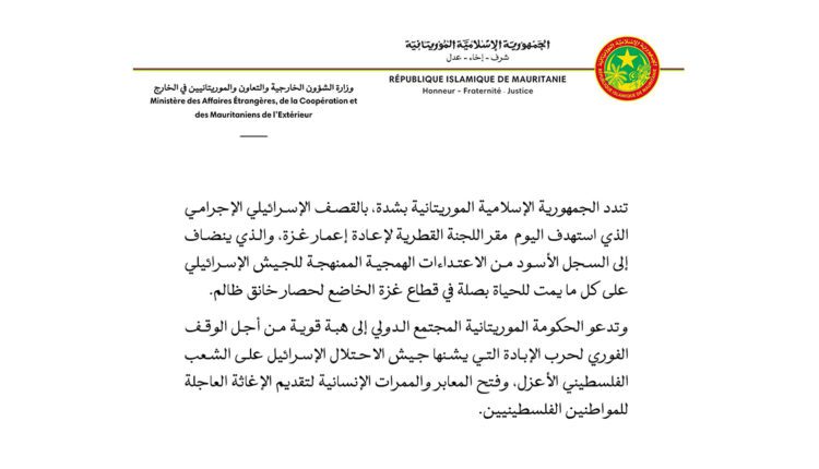 “The Islamic Republic of Mauritania strongly condemns the criminal Israeli bombardment today of the headquarters of the Qatari Committee for the Reconstruction of Gaza, which adds to the dark record of systematic barbaric attacks by the Israeli army against everything related to life in the Gaza Strip, which is under a suffocating and unjust siege.