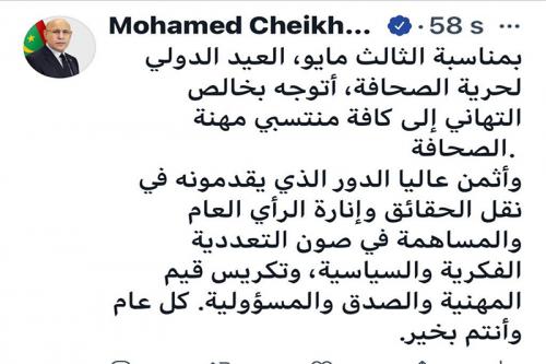The President of the Republic, His Excellency Mr. Mohamed Ould Cheikh El Ghazouani, congratulated the journalists, on the occasion of the celebration of World Press Freedom Day.
