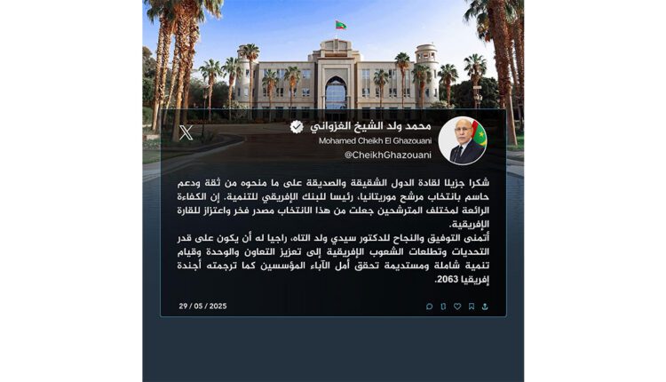 “Thank you to the leaders of brotherly and friendly countries for their confidence and decisive support in the election of Mauritania’s candidate for the presidency of the African Development Bank. The remarkable competence of the different candidates made this election a source of pride for the African continent.