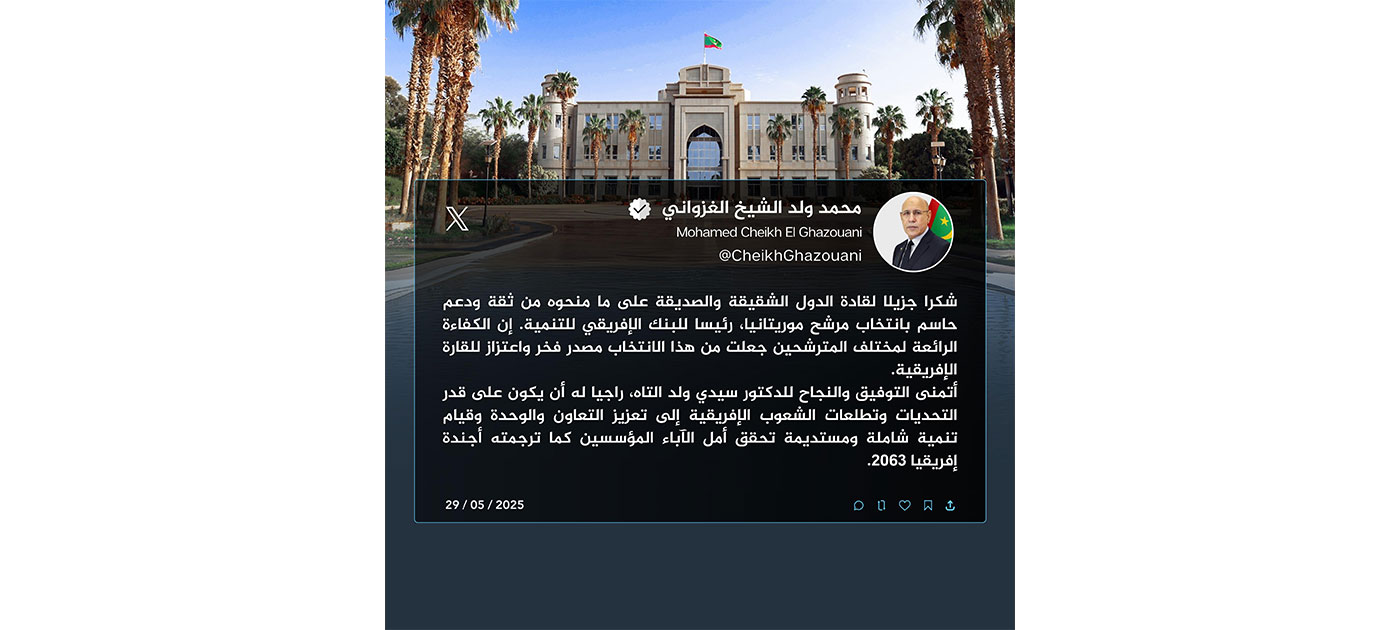 H.E. the President of the Republic, Mr. Mohamed Ould Cheikh El Ghazouani, expressed his sincere thanks to the leaders of brotherly and friendly countries for their confidence and decisive support in the election of Mauritania’s candidate for the presidency of the African Development Bank (AfDB).