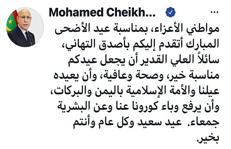 The President of the Republic, His Excellency Mohamed Ould Cheikh El Ghazouani, congratulated the Mauritanian people, on Thursday evening, on the occasion of the blessed Eid Al-Adha.