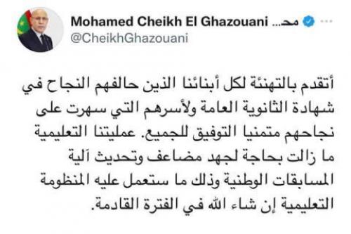 The President of the Republic, His Excellency Mohamed Ould Cheikh El Ghazouani, congratulated the students who had the chance to pass the baccalaureate exams as well as their families who have endured and helped their success, wishing everyone success.