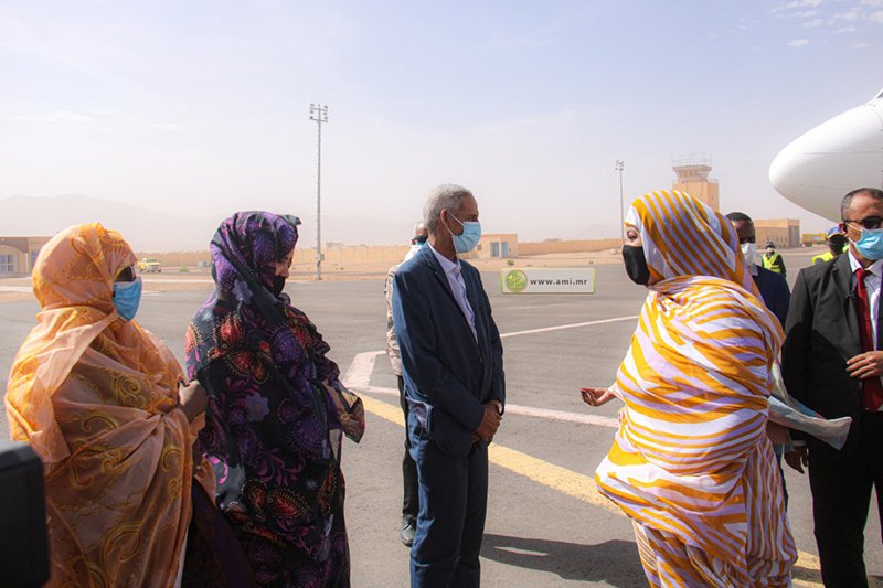 The first lady was received at Zouerate Airport by the Wali of Tiris Zemmour, Mr. Slama Ould Sidi, the Vice President of the Regional Council for the Tires Zemmour region, Mr. Suleiman Barro, the Mayor of Zouerate Municipality, Mrs. Salka Mint Mohamed, representatives of the state of Tiris Zemmour, the administrative and security authorities and some dignitaries and regional managers.