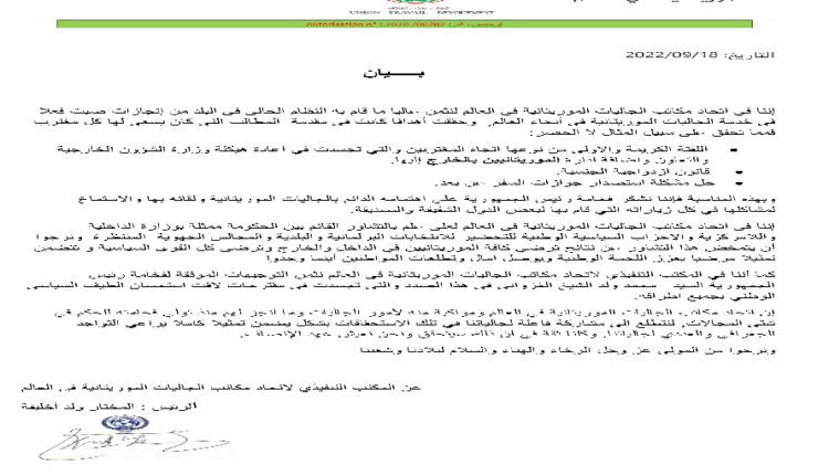 Nous, à l’Union des bureaux des communautés mauritaniennes dans le monde, sommes conscients de la concertation en cours entre le gouvernement représenté par le ministère de l’Intérieur et de la Décentralisation et les partis politiques nationaux pour préparer les prochaines élections législatives et municipales et des conseils régionaux. Nous espérons que cette consultation produira des résultats qui satisferont tous les Mauritaniens à l’intérieur et à l’extérieur, répondront aux attentes de toutes les forces politiques et incluront une représentation satisfaisante qui renforce la cohésion nationale et traduit les espoirs et les aspirations des citoyens où qu’ils se trouvent.