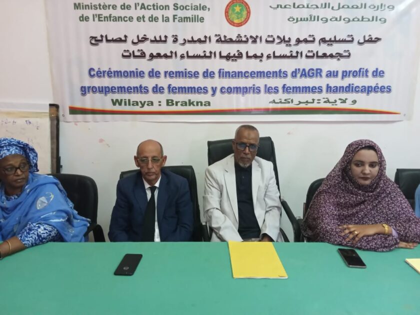 Le wali mouçaid du Brakna, M. Mohamed Abdel Vettah Ould Ahmed, a supervisé, mercredi, dans les locaux de la direction régionale du ministère de l’Action Sociale, de l’Enfance et de la Famille dans la ville d’Aleg, la cérémonie de remise des fonds pour financer les activités génératrices de revenus (AGR) au profit des groupements féminins, y compris les femmes handicapées, financement consenti par le ministère de l’Action Sociale, de l’Enfance et de la Famille.