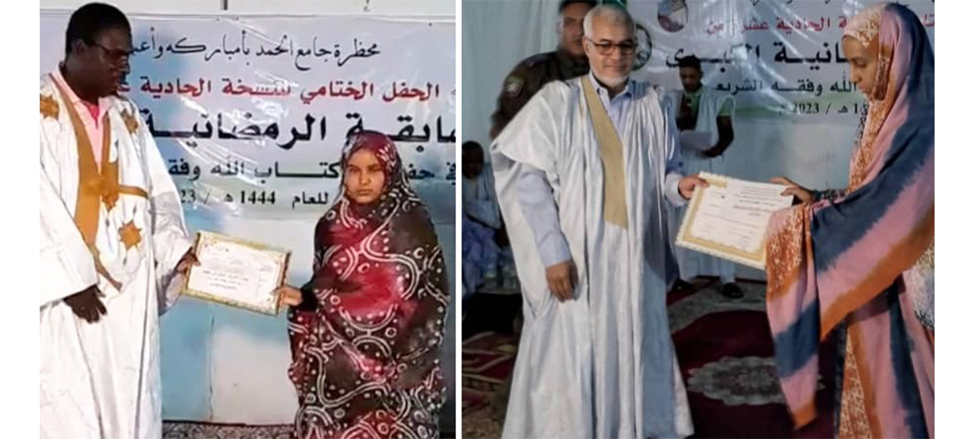 les deux filles, Aminetou Mint Chrif et Oumekelthoum Mint Lekhoueime ont été récompensées lundi soir des premiers prix du concours de récitation du Saint Coran et du Fikh organisé par la mahadra de la mosquée “El Hamd” d’Atar.