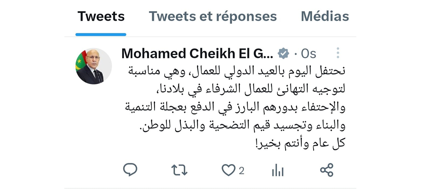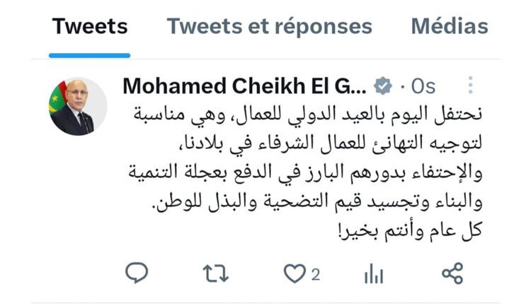 Son Excellence le Président de la République, M. Mohamed Ould Cheikh El Ghazouani, a félicité, aujourd’hui, lundi 1er mai, les honorables travailleurs de notre pays, à l’occasion de leur Journée internationale.
