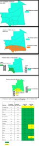 Cependant pour le reste du pays on attend des cumuls pluviométriques normaux à excédentaires (équivalents supérieurs à la moyenne de la période de référence 1991-2020), dans la zone qui couvre l’est de l’Assaba et du Tagant, les deux Hodhs, Tiris Zemour, l’Adrar, l’Inchiri, Nouakchott et Dakhlet Nouadhibou.