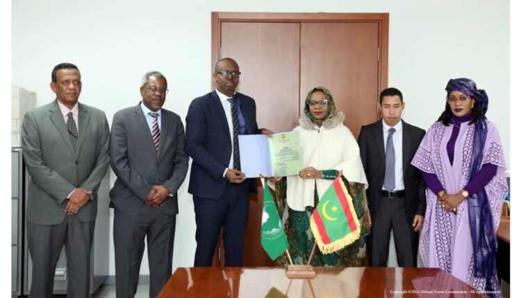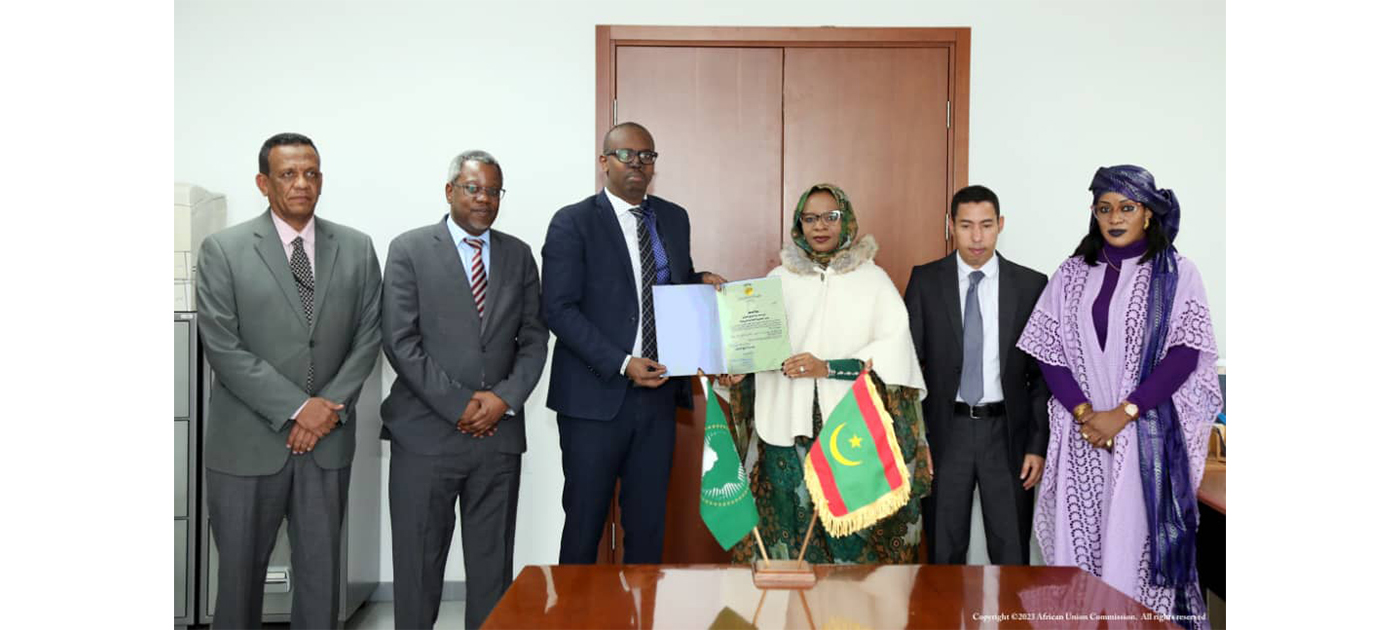 La cérémonie de dépôt s’est déroulée en présence de S.E. Mme Khadija Mbarek Fall, ambassadrice de Mauritanie en Éthiopie et sa Représentante permanente auprès de l’Union africaine, accompagnée de M. Mohamed Ould Talaba et de Mme Aminata Ba, Conseillers à l’ambassade, tandis que la Commission de l’Union africaine était représentée par le Conseiller juridique, Dr. Ki Fleere, entouré de son équipe de bureau, du Directeur des infrastructures et de l’énergie et de certains de ses collaborateurs.