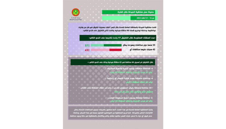 L’Inspection a indiqué que le résultat de ses contrôles au cours de la période du 16 au 31 août 2023 ont permis l’inspection de 98 structures pharmaceutiques, dans les wilayas de Nouakchott et celle de Nouakchott.