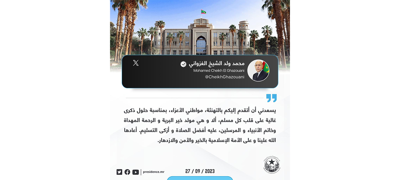 Son Excellence le Président de la République, M. Mohamed Ould Cheikh El Ghazouani a, dans un tweet publié mercredi, sur son compte tweeter, félicité les citoyens à l’occasion de l’anniversaire de l’Aid Nebewi (naissance du Prophète, Paix et Salut sur Lui).