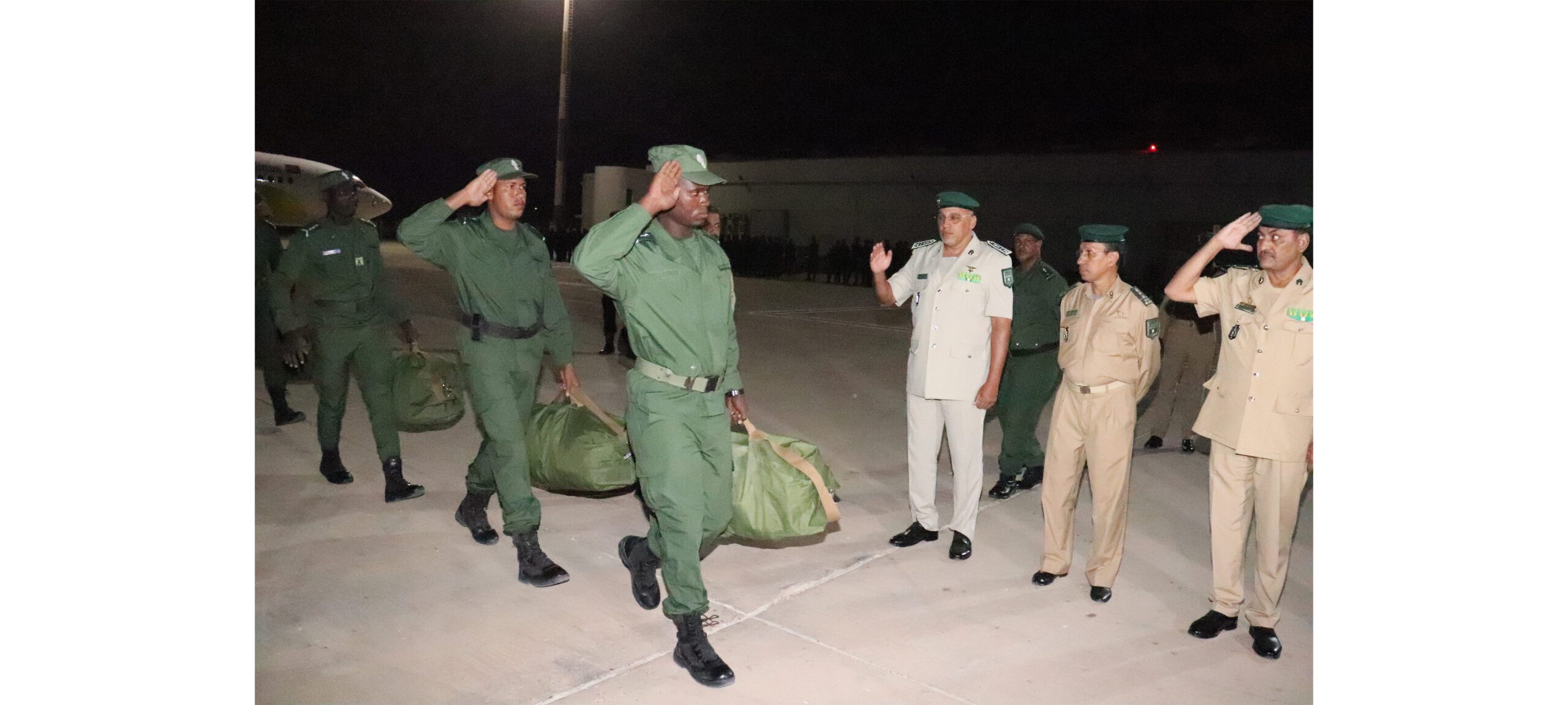 Le Chef d’État-major adjoint de la Gendarmerie nationale, le général de brigade Mohamed Mahmoud Ould Taya, a supervisé, jeudi matin à l’aéroport international de Nouakchott Oumtounsy, la cérémonie de départ du 15e contingent de la gendarmerie pour la ville de Bria en République de Centrafrique où il opérera dans le cadre des forces de maintien de la paix des Nations Unies, et en remplacement d’un autre contingent mauritanien rentré hier soir au pays après avoir assuré cette même mission avec professionnalisme et engagement.
