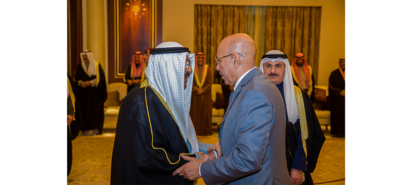 Son Excellence le Président de la République, Monsieur Mohamed Ould Cheikh El-Ghazouani, a présenté lundi soir à Koweït city, ses condoléances personnelles et celles du peuple et du gouvernement mauritaniens à Son Altesse Cheikh Meshaal Al-Ahmad Al-Sabah, Émir de l’État frère du Koweït, et à travers lui au peuple et au gouvernement koweïtiens frères à l’occasion du décès de feu Cheikh Nawaf Al-Ahmad Al-Jaber Al-Sabah.