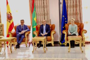 Le Chef du gouvernement  espagnol et la présidente du commissariat européen ont été accueillis à la passerelle de l’avion à l’aéroport international Oumtounsi par Son excellence le Président de la République, Monsieur Mohamed Ould Cheikh El Ghazouani entouré du Premier ministre, M. Mohamed Bilal Messoud, du ministre chargé du Cabinet du Président de la République, du chef d’Etat-major particulier du Président de la République, du wali de Nouakchott-Ouest, de la vice-présidente de la Région de Nouakchott, de SEMme l’ambassadrice d’Espagne accréditée en Mauritanie et du président de la Mission européenne.