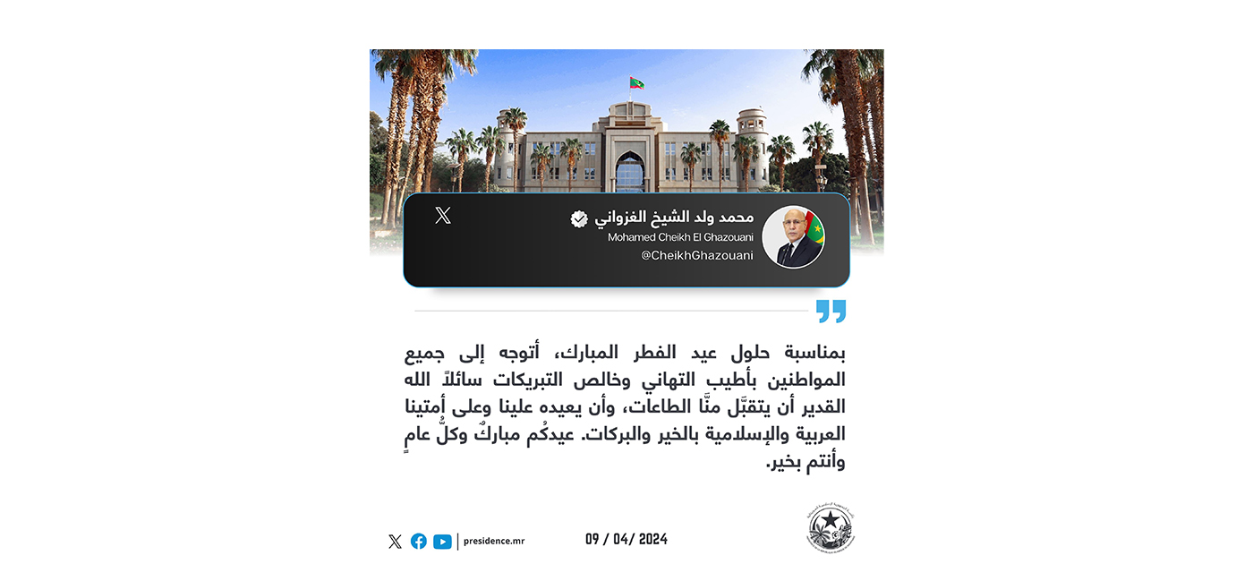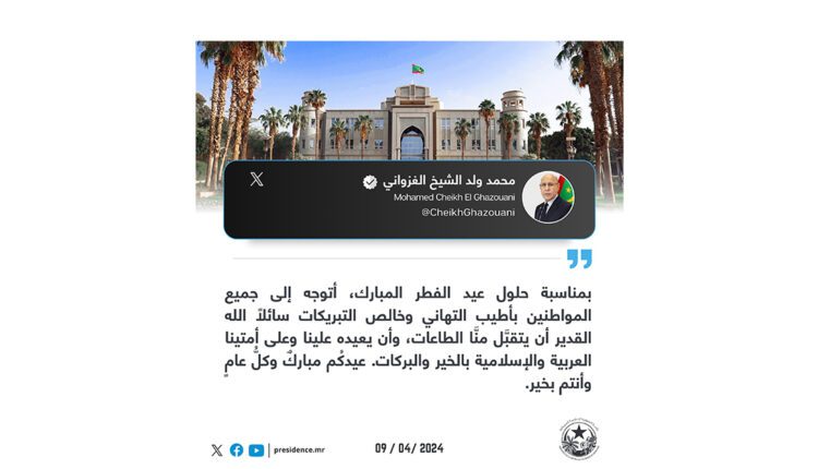 Son Excellence le Président de la République, Monsieur Mohamed Ould Cheikh El Ghazouani, a félicité, mardi soir, tous les citoyens à l’occasion de l’Id El Fitr.