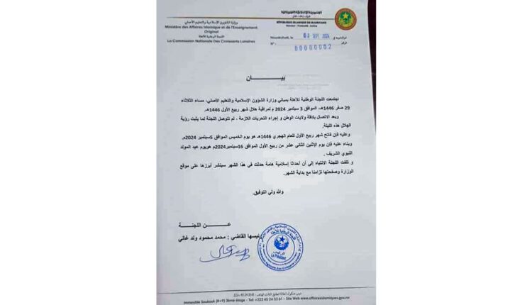 La commission nationale d’observation du croissant lunaire a annoncé dans un communiqué rendu public mardi soir que le 1er du mois de Rabi’ al Awwal de l’année 1446 de l’hégire est demain, jeudi 05 septembre. Il s’ensuit que le jour de la fête est le lundi 16 septembre courant.