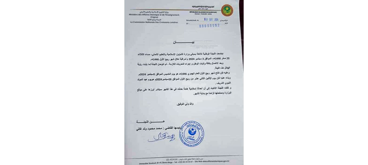 «La commission nationale d’observation du croissant lunaire s’est réunie dans les locaux du ministère des Affaires islamiques et de l’Enseignement originel le mardi soir 29 Safar 1446 de l’hégire, correspondant au 3 septembre 2024, pour observer le croissant du mois de Rabi’ al Awwal 1446 de l’hégire.
