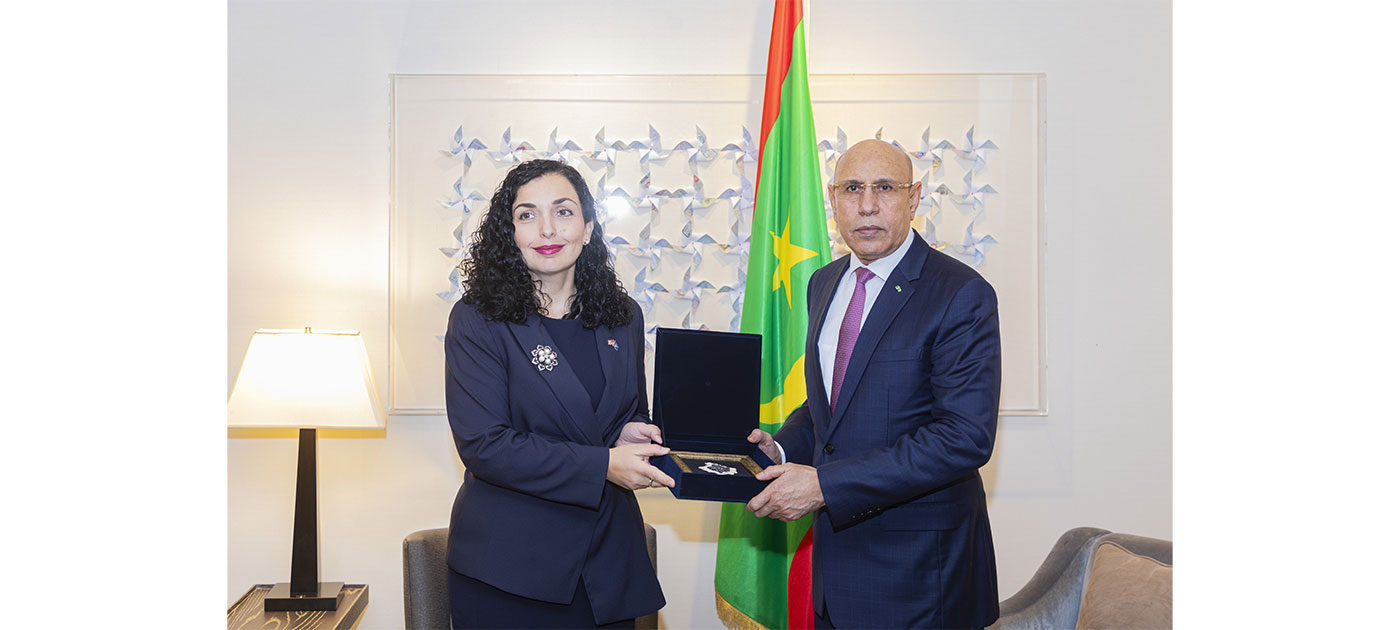 En marge de la 79ème session ordinaire de l’Assemblée générale des Nations Unies, Son Excellence le Président de la République et Président de l’Union africaine (UA), M. Mohamed Ould Cheikh El Ghazouani, a rencontré mardi la Président de la République du Kosovo, Vjosa Osman.
