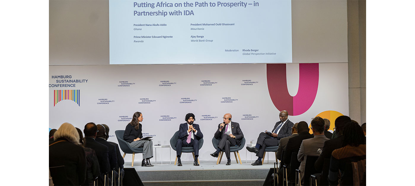 Monsieur Mohamed Cheikh El Ghazouani, Président de la République, Président en exercice de l’Union Africaine, a participé, dans le cadre de la Conférence de Hambourg sur le développement durable, à un panel sur le thème « Mettre l’Afrique sur la voie de la prospérité en partenariat avec l’IDA”.