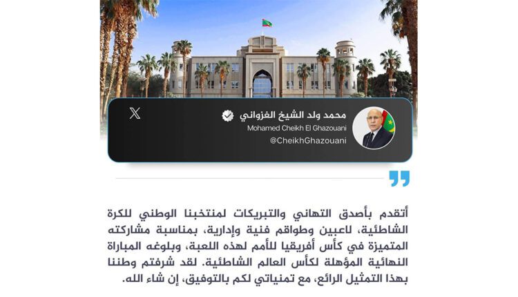 Son Excellence le Président de la République Mohamed Ould Cheikh El Ghazouani a félicité samedi l’équipe nationale de Beach Soccer pour sa remarquable participation à la Coupe d’Afrique des Nations.