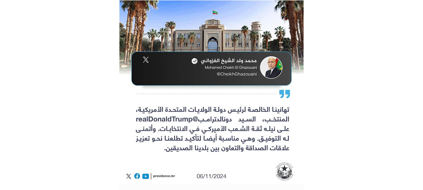 SEM le Président de la République Mohamed Ould Cheikh Ghazouani a félicité mercredi le Président élu des États-Unis d’Amérique, Donald Trump, pour sa victoire à l’élection présidentielle.