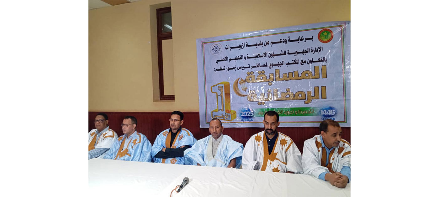 Le wali du Tiris Zemmour, M. Tayeb Ould Mohamed Mahmoud, a présidé hier soir dans la ville de Zouerate la cérémonie de clôture de la première édition du concours ramadanesque de mémorisation et de récitation du Saint Coran, organisé par la Direction régionale des Affaires islamiques et de l’Enseignement originel, en coopération avec le Bureau régional des Mahadras du Tiris Zemmour, et avec le parrainage et le soutien de la commune de Zouerate.