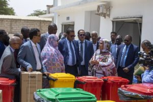 La Ministre de l’Environnement et du Développement Durable a également remis des équipements environnementaux pour la gestion des déchets, dans le cadre du programme de développement prioritaire de la ville de Nouakchott, aux secrétaires généraux des secteurs gouvernementaux et aux walis de Nouakchott.