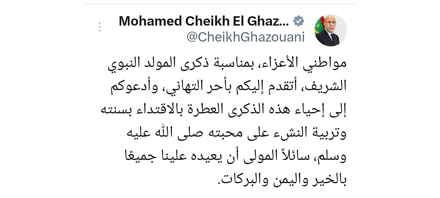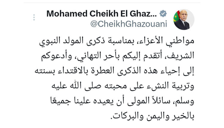 Son Excellence le Président de la République, M. Mohamed Ould Cheikh El Ghazouani, a félicité ses concitoyens à l’occasion de l’anniversaire de la naissance du Prophète (PSL), les exhortant à suivre la Sunna du Prophète et à éduquer la jeunesse à l’aimer, que la paix et le salut soient sur lui.