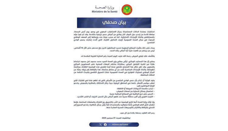 Le ministère a expliqué que les urgences du Centre hospitalier régional de Rosso ont accueilli hier vendredi un citoyen souffrant de symptômes avancés de fièvre hémorragique, indiquant qu’il a été immédiatement isolé à l’hôpital et que des mesures préventives ont été prises. Un échantillon a été prélevé et envoyé à l’Institut national de recherche en santé publique pour les analyses nécessaires, qui ont confirmé son infection par la fièvre de la vallée du Rift.