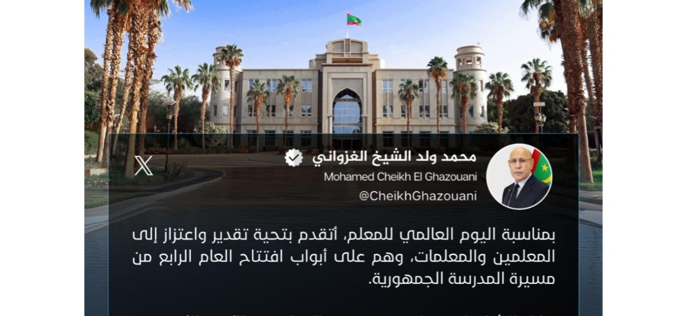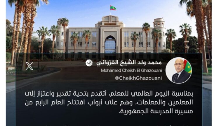 Son Excellence le Président de la République, M. Mohamed Ould Cheikh El Ghazouani, a exprimé sa gratitude et son appréciation aux enseignants pour leurs nobles efforts et leur dévouement illimité dans la formation des générations.