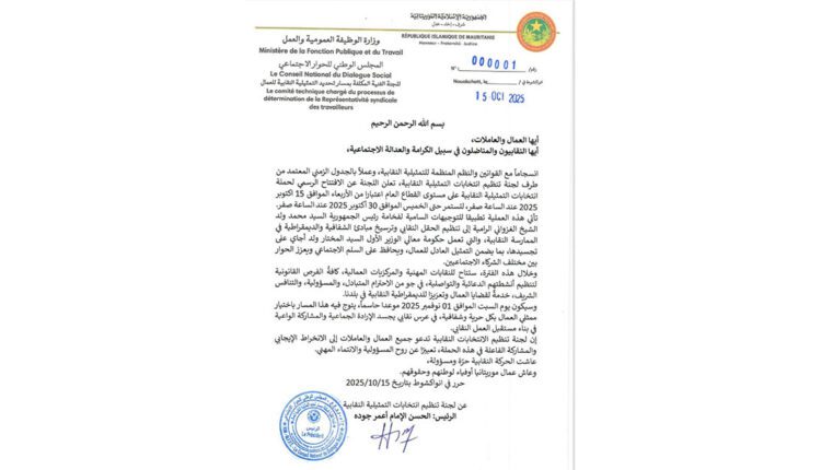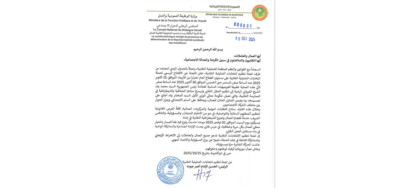 Un communiqué publié mercredi par le comité, dont l’Agence mauritanienne d’information (AMI) a reçu copie, précise que ce processus s’inscrit dans le cadre des directives de Son Excellence le Président de la République, M. Mohamed Ould Cheikh El Ghazouani, visant à organiser le monde syndical et à consolider les principes de transparence et de démocratie dans la pratique syndicale. Ce que le gouvernement du Premier ministre Moctar Ould Djay s’emploie à mettre en œuvre, en garantissant une représentation équitable des travailleurs, en préservant la paix sociale et en renforçant le dialogue social.