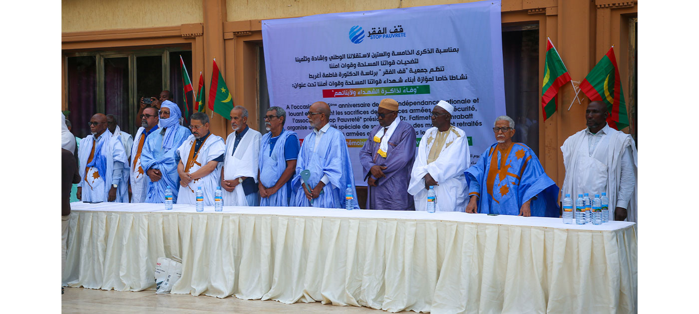 L’association “Stop à la pauvreté” a organisé ce samedi soir à Nouakchott une cérémonie d’hommage pour soutenir les enfants des martyrs des forces armées et de sécurité, à l’occasion du soixante-cinquième anniversaire de la Fête de l’Indépendance nationale, et en reconnaissance des sacrifices des forces armées et des forces de sécurité, sous le slogan : “Fidélité à la mémoire des martyrs et à leurs enfants”.