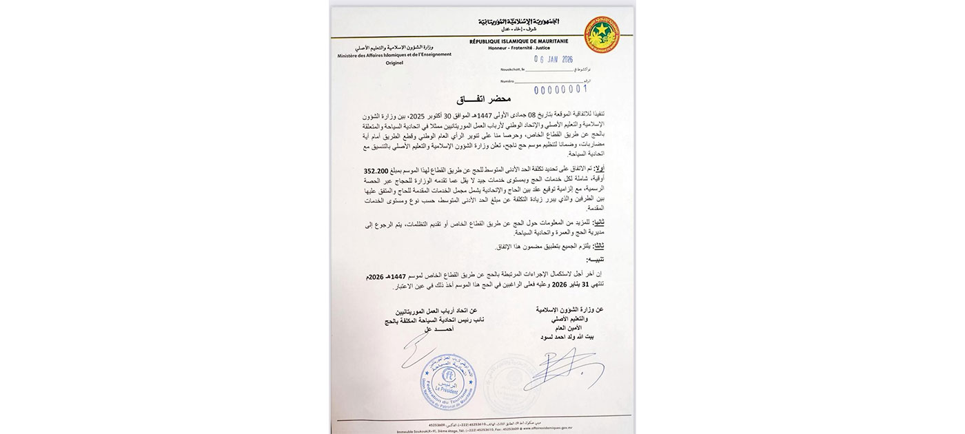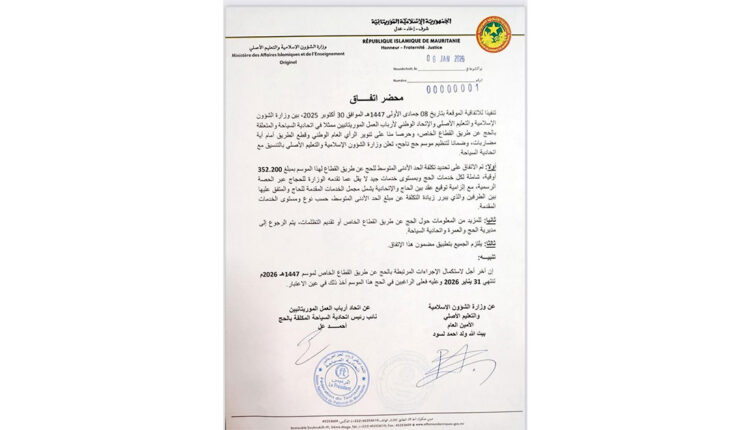 Le ministère des Affaires islamiques et de l’Enseignement originel, en collaboration avec l’Union nationale du patronat de Mauritanie – Fédération du tourisme, a annoncé les détails de l’organisation du Hajj via le secteur privé pour la saison 1447 AH/2026 AD.