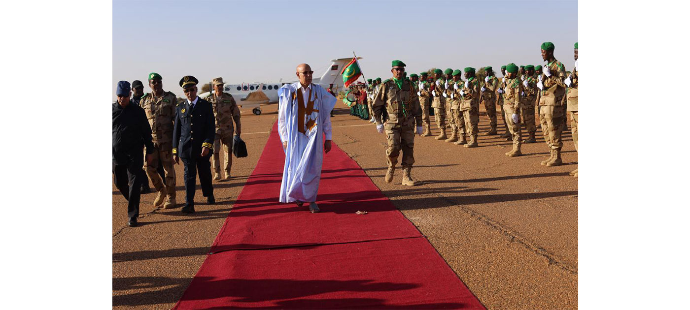 Son Excellence le Président de la République a été accueilli à la passerelle de l’avion à l’aéroport de Kaédi par le Wali du Gorgol, M. Mohamed El Mokhtar Ould Abdi, le commandant de la septième région militaire, le colonel Ammar Ahmedou Hannana, le Hakem de la moughataa de Kaédi, M. Sidna Ould Zein El Abidine, le maire de la commune de Kaédi et les députés de la moughataa, avant que Son Excellence ne passe en revue des unités des forces armées qui lui ont rendu les honneurs.