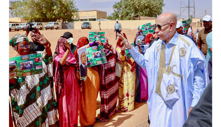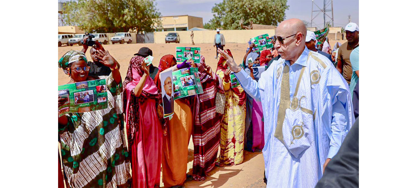 Son Excellence le Président de la République, Monsieur Mohamed Ould Cheikh El Ghazouani, s’est arrêté aujourd’hui vendredi, en quittant la ville de Monguel, pour saluer un groupe de bénéficiaires des programmes sociaux mis en œuvre par la Délégation Générale à la Solidarité Nationale et à la Lutte contre l’Exclusion “TAAZOUR”, qui avaient organisé un rassemblement sur le chemin du cortège présidentiel.