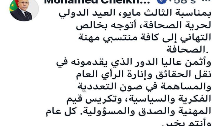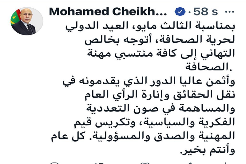 Le Président de la République, Son Excellence Monsieur Mohamed Ould Cheikh El Ghazouani a félicité les journalistes, à l’occasion de la célébration de la journée internationale de la liberté de la presse.