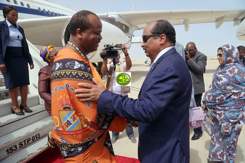 وكان فخامة رئيس الجمهورية السيد محمد ولد عبد العزيز والسيدة الأولى مريم بنت احمد الملقبة تكبر على رأس مستقبلي جلالة الملك محاطين بالوزير الأول السيد محمد سالم ولد البشير والوزيرالأمين العام لرئاسة الجمهورية ومدير ديوان رئيس الجمهورية وسفير موريتانيا المعتمد لدى مملكة اسواتيني وقادة أركان القوات المسلحة وقوات الأمن ووالي نواكشوط الغربية .