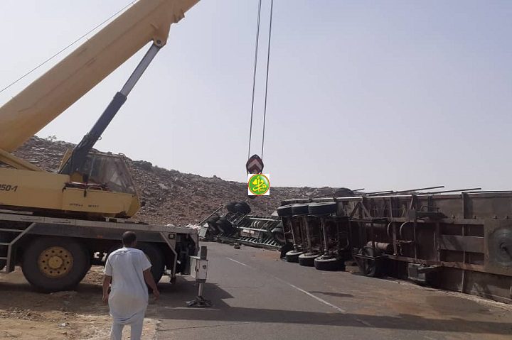 “استمرارا لتطبيق وتنفيذ الاستراتجية الوطنية للسلامة الطرقية التي تندرج في إطار برنامج فخامة رئيس الجمهورية السيد محمد ولد الشيخ الغزواني وأشرف على إطلاقها معالي الوزير الأول السيد اسماعيل ولد بده ولد الشيخ سيديا بداية دجمبر الماضي تدخلت صباح الخميس 13 فبراير 2020 , بمتابعة مباشرة من معالي وزير التجهيز والنقل السيد محمدو ولد امحيميد وتنسيق تام مع والي ولاية أدرار, آليات تم تحريكها من طرف الشركة الوطنية للتنظيف والأشغال والنقل والصيانة attm بشكل عاجل وذلك ضمن مقاربة تكاملية وتنسيقية وفي انتظار وصول آليات التدخل هذه , كانت فرقة من الدرك الوطني قد تمركزت حول الشاحنتين من أجل تحسيس سالكي الطريق و تسيير حركة المرور بغية تفادي أي خطر قد يتهددهم.