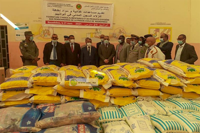 أشرف معالي مفوض حقوق الانسان والعمل الإنساني والعلاقات مع المجتمع المدني، السيد محمد الحسن ولد بوخريص، رفقة والي داخلت نواذيبو، السيد يحيى ولد الشيخ محمد فال، مساء اليوم السبت على تقديم كميات من المواد الأساسية ومواد التنظيف لصالح نزلاء السجن المدني في مدينة نواذيبو.