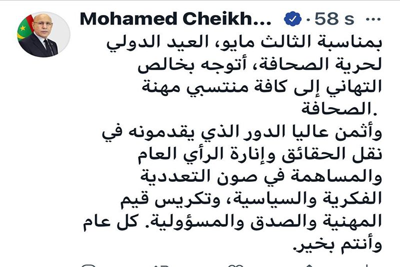 هنأ فخامة رئيس الجمهورية، السيد محمد ولد الشيخ الغزواني، منتسبي مهنة الصحافة، بمناسبة الثالث مايو، العيد الدولي لحرية الصحافة.