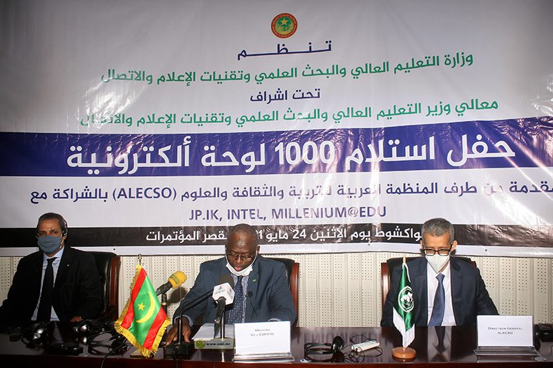 تسلمت وزارة التعليم العالي والبحث العلمي وتقنيات الإعلام والاتصال اليوم الاثنين بقصر المؤتمرات في نواكشوط 1000 حاسوب محمول لصالح بعض الطلاب المتفوقين في السنوات الثواني من مؤسسات التعليم الجامعي، مقدمة من طرف المنظمة العربية للتربية والثقافة والعلوم (الألكسو) بالتعاون مع شركتي “إينتيل” و”جي بى”.