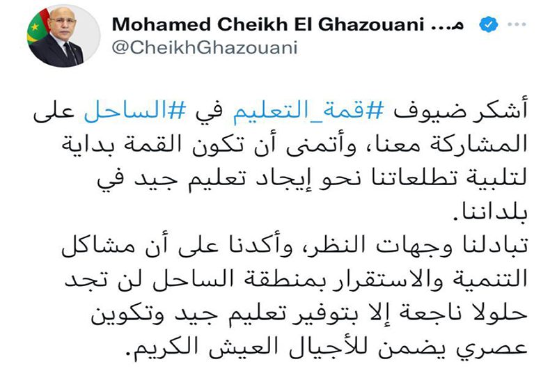 أعرب فخامة رئيس الجمهورية السيد محمد ولد الشيخ الغزواني عن أمله في أن تكون قمة التعليم في الساحل بداية لتلبية التطلعات نحو إيجاد تعليم جيد.
