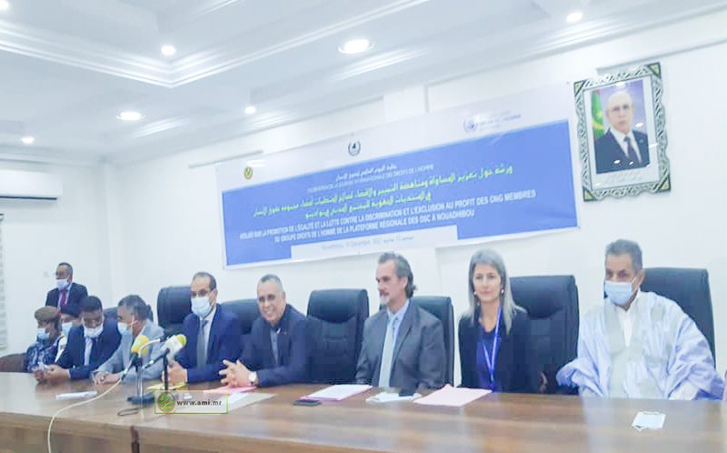 أشرف معالي مفوض حقوق الإنسان والعمل الإنساني والعلاقات المجتمع المدني، السيد الشيخ أحمدو ولد أحمد سالم ولد سيدي، اليوم الجمعة بمدينة انواذيبو على افتتاح ورشة تكوينية حول تعزيز المساواة ومناهضة التمييز والإقصاء لصالح بعض المنظمات الممثلة في المنتديات الجهوية للمجتمع المدني في انواذيبو.