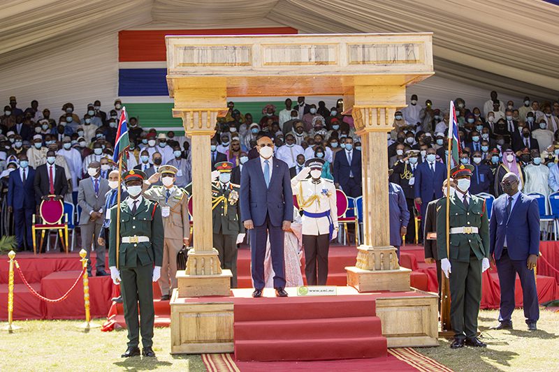 واستقبل رئيس الجمهورية لدى وصوله ملعب الاستقلال بالعاصمة بانجول بحفاوة كبيرة، تميزت بعزف النشيد الوطني الموريتاني احتفاء بمشاركة سيادته إلى جانب قادة عدد من دول غرب إفريقيا وممثلين عن المنظمات الإقليمية والدولية.