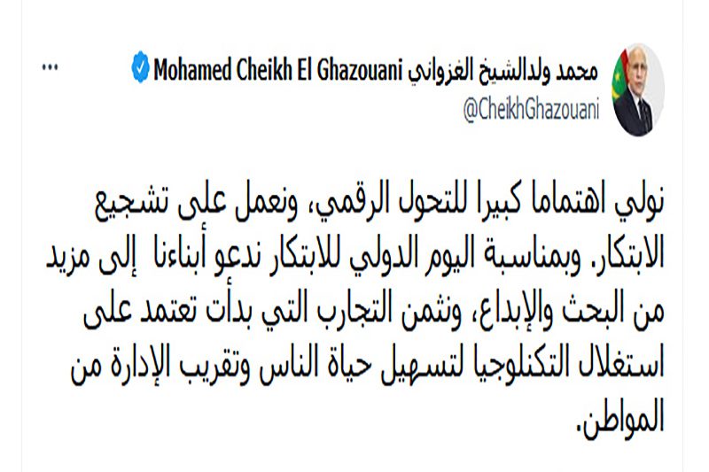 دعا فخامة رئيس الجمهورية السيد محمد ولد الشيخ الغزواني، اليوم الخميس بمناسبة اليوم الدولي للابتكار، أبناء موريتانيا إلى المزيد من البحث والإبداع، مثمنا التجارب التي بدأت تعتمد على استغلال التكنلوجيا لتسهيل حياة الناس وتقريب الإدارة من المواطن.