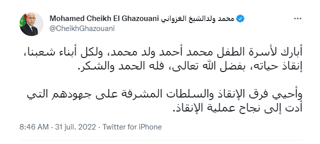 وكتب فخامة رئيس الجمهورية: “أبارك لأسرة الطفل محمد أحمد ولد محمد، ولكل، إنقاذ حياته، بفضل الله تعالي، فله الحمد والشكر، وأحي فرق الإنقاذ والسلطات المشرفة على جهودهم التي أدت إلى نجاح عملية الإنقاذ”.