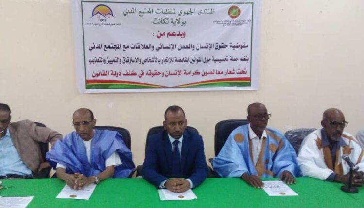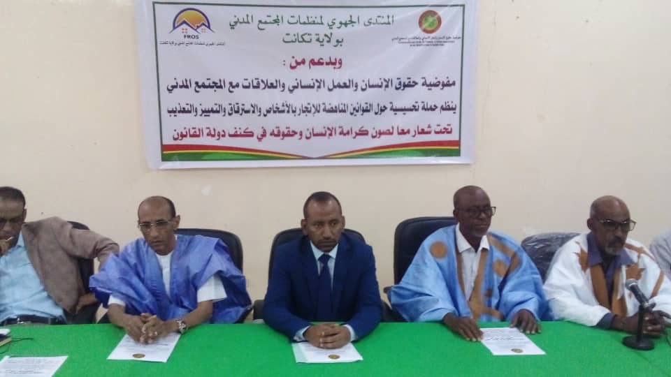 ومن جانبه شكر رئيس المنتدى الجهوي للمجتمع المدني بولاية تكانت السيد سيدي محمد ولد محمد الحسن السلطات المحلية على مواكبتها ودعمها الدائم لجهود المنتد ى في تنفيذ رسالته الإنسانية .وأضاف أن المنتدى كون فرقا لضمان نجاح الحملة ستجوب جميع مناطق الولاية للتحسيس حول القوانين المناهضة للإتجار بالأشخاص والإسترقاق والتمييز والتعذيبن، مطالبا الجميع بالتفاعل معها ومواكبة جهودها التحسيسية انطلاقا من ان العملية تتطلب مشاركة الجميع.