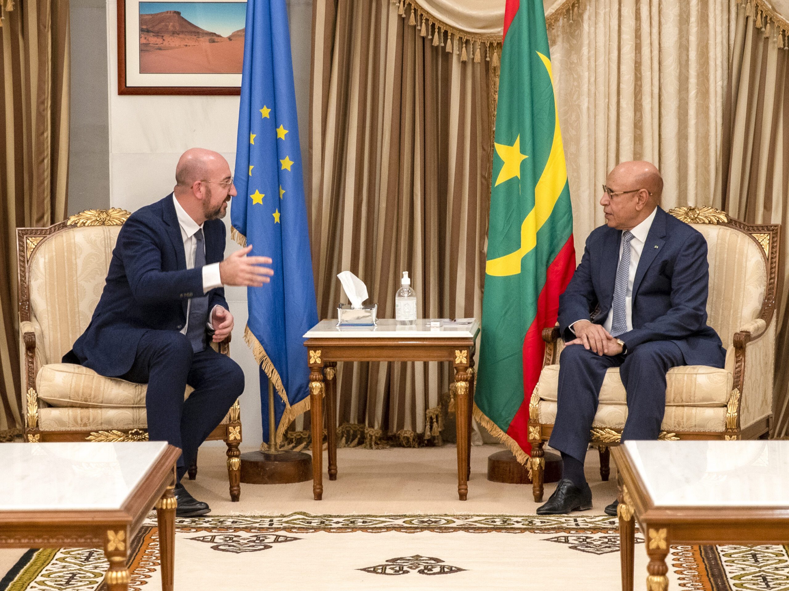 وقد أجرى فخامة رئيس الجمهورية جلسة مباحثات على انفراد مع المسؤول الأوروبي، قبل أن توسع لتشمل أعضاء الوفدين المرافقين.