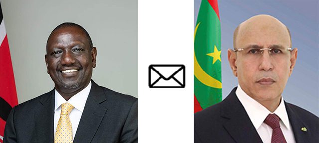 جدد فخامة رئيس الجمهورية السيد محمد ولد الشيخ الغزواني لرئيس الكيني صاحب الفخامة السيد ويليام روتو، رئيس جمهورية كينيا، حرص موريتانيا موريتانيا على تطوير علاقات التعاون بين البلدين الشقيقين.