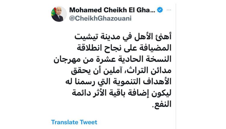 هنأ فخامة رئيس الجمهورية، السيد محمد ولد الشيخ الغزواني في تغريدة له اليوم السبت على صفحته على “توتير” سكان مدينة تيشيت على نجاح انطلاقة النسخة الحادية عشرة من مهرجان مدائن التراث، التي بدأت يوم أمس بهذه المدينة العريقة.